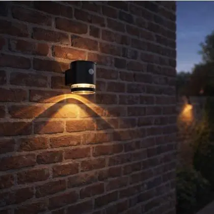 Illumina i tuoi spazi esterni con la D’Lite Solis Wall Light – una lampada da parete a energia solare che unisce design moderno ed efficienza energetica. Con la sua elegante finitura nera e l’effetto luminoso verso l’alto e verso il basso, questa applique valorizza ogni parete esterna offrendo allo stesso tempo un’illuminazione pratica. Il sensore di movimento integrato garantisce che la luce si accenda solo quando necessario, assicurando sicurezza e risparmio energetico.