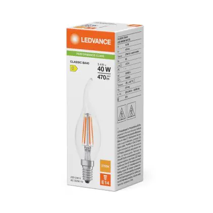 La lampada Ledvance Classic LED E14 Candela Filamento Chiara 3.4W 470lm - 827 Bianco Molto Caldo | Sostitutiva 40W è il sostituto perfetto per le tue vecchie lampade 40W con attacco a vite piccolo E14 grazie alla sua tecnologia LED. Passare a LED ti offrirà molti vantaggi!